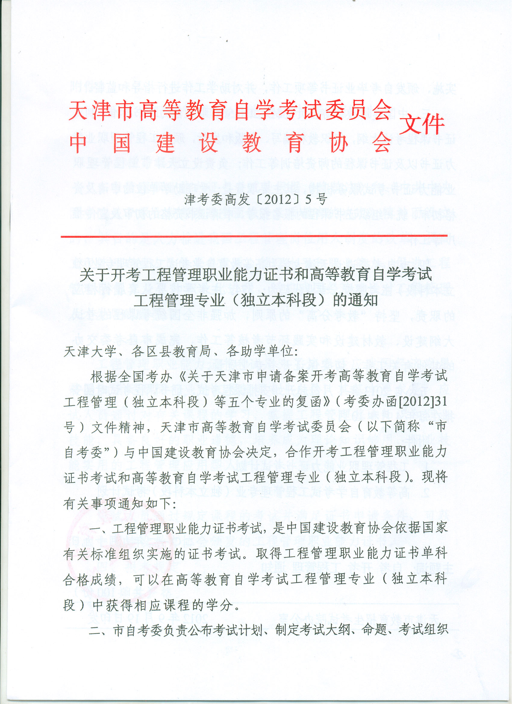 津考委高发[2012]5号 关于开考工程管理职业能力证书和高等教育自学考试工程管理专业(独立本科段)的通知