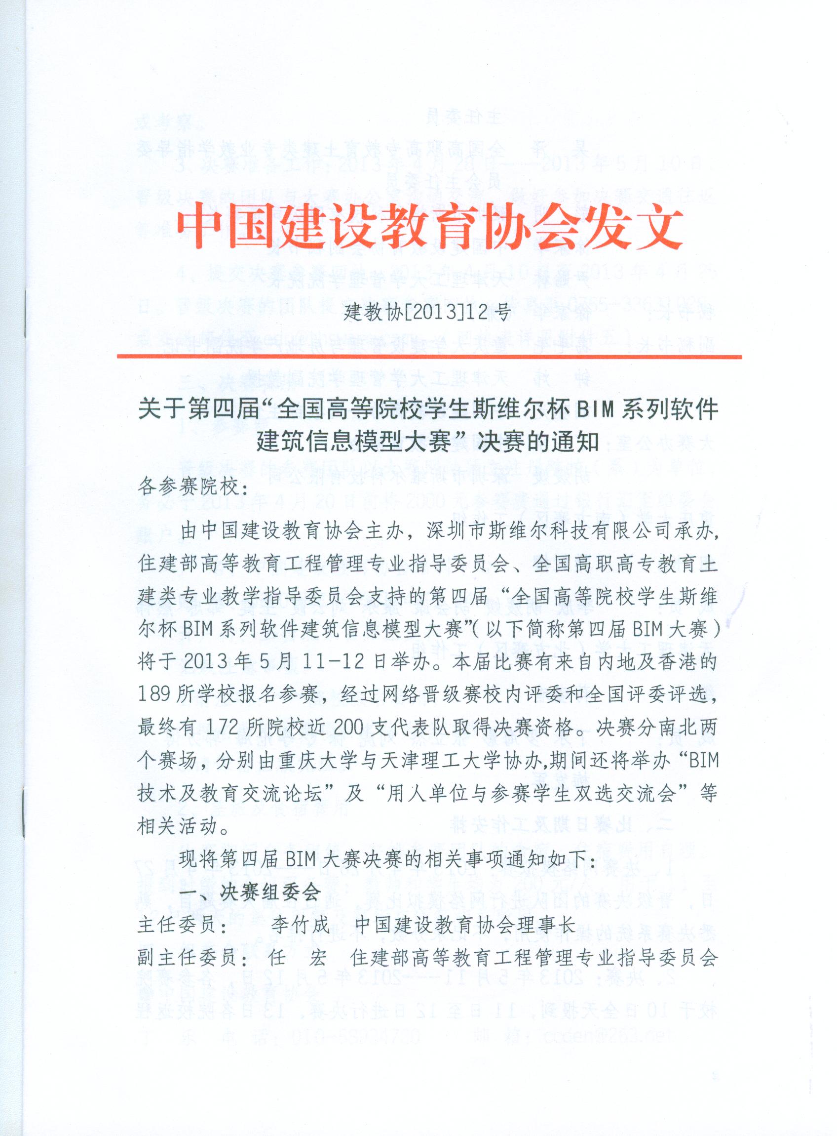 关于第四届“全国高等院校学生斯维尔杯BIM系列软件建筑信息模型大赛”决赛的通知