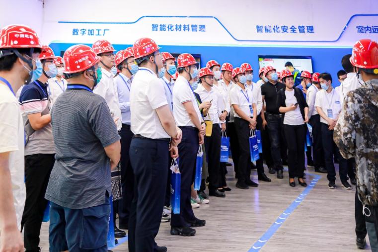 随后,与会代表在中建三局智安产业基地项目管理人员的引导下,先后参观了项目5G 展厅、数智建造管理应用展台、机电数智化加工厂、精益建造展示区。通过讲解员讲解、现场观摩、体验等多种形式交流学习了以5G为代表的信息化、智能化技术在实现建筑业转型升级方面的重要作用。