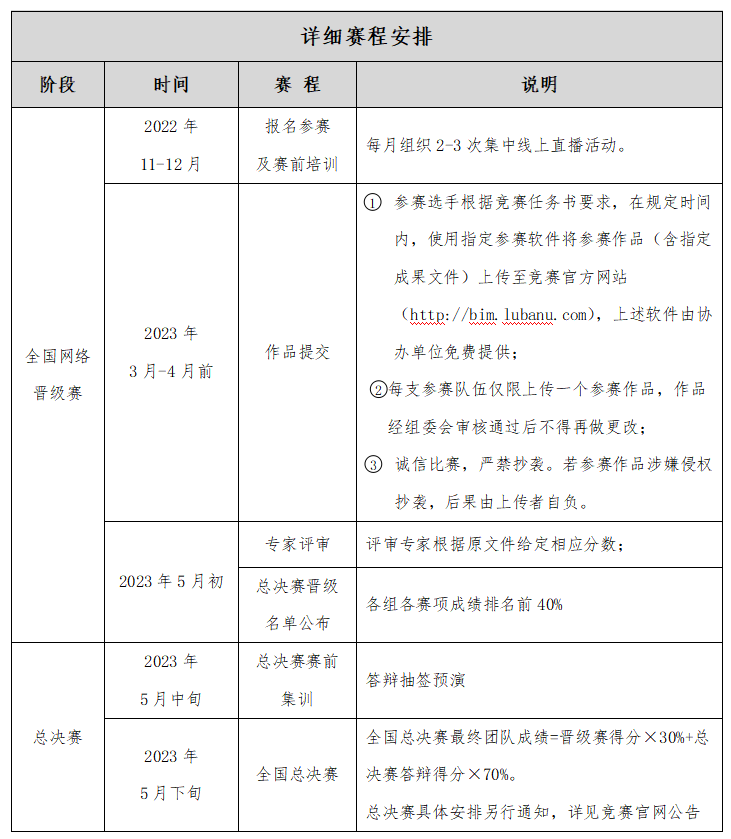 为全面贯彻落实《中共中央关于制定国民经济和社会发展第十四个五年规划和二〇三五年远景目标的建议》,加快培养创新性人才,促进院校教学改革,推动高等教育高质量发展。Beat365中文官方网站协会决定举办2023年“鲁班杯”全国高校BIM毕业设计作品大赛。“鲁班杯”全国高校BIM毕业设计作品大赛已成长为覆盖全国建筑类高校、面向在校大学生影响力较大的高校盛会,竞赛的举办有助于激发人才活力与创造热情,望各相关院校积极参与。现将有关事项通知如下: