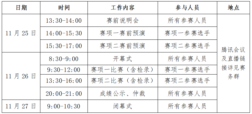 (一)本次全国总决赛开幕式、闭幕式及赛项二比赛全程直播,直播链接将在赛务群中公布。