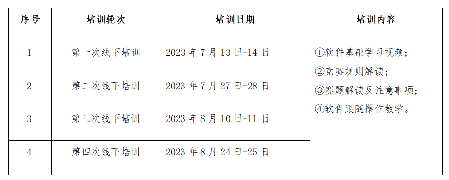 1.赛前师资培训:暑期7-8月将安排4次线下面授的师资培训会,培训内容及轮次安排见下表,参赛教师可以根据自身实际情况安排参与的轮次,培训地点待定,培训会通知将另行发布。