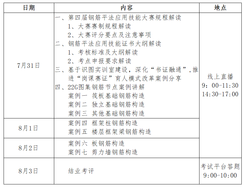为进一步贯彻国务院、教育部有关“弘扬工匠精神,助力技能强国,大力培养应用型人才队伍”等系列文件精神,深化产教融合,校企合作,加强平法师资队伍建设,助力钢筋平法应用技能大赛顺利进行,拟定于2023年 7月31日-8月2日举办“第四届全国建筑类院校钢筋平法应用技能大赛线上师资培训班”,望院校选派老师参加,具体通知如下: