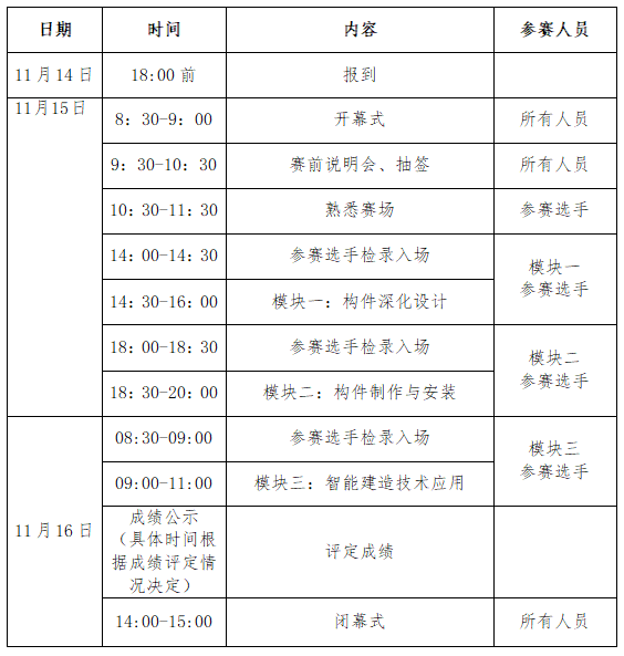 参赛队以省为单位组队,具体依据区域预赛遴选结果或区域推荐结果。竞赛内容包括三个竞赛模块:模块一(构件深化设计)、模块二(构件制作与安装)、模块三(智能建造技术应用),均为单人竞赛项目。每名参赛选手最多可设2名教练员,每个参赛队伍设领队1名。